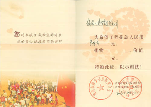 海川集團多年來一直把履行社會義務(wù),回饋社會,報效祖國作為企業(yè)的重要職責,在企業(yè)發(fā)展的同時,不忘社會公益事業(yè),十幾年來已向社會公益事業(yè)捐款累計超過460萬元:先后向青島市教師素質(zhì)專項基金捐款30萬元,捐建貴州江口縣雙江鎮(zhèn)希望中學30萬元,捐建膠南市黃山鎮(zhèn)希望小學30萬元。并通過基金會捐助惜福鎮(zhèn)后金小學多臺電腦用于教學,2013年4月,又向惜福鎮(zhèn)“為了惜福孩子的明天”大型公益活動捐款30萬元。另外,在汶川地震期間,組織廣大職工開展賑災(zāi)捐助活動,奉獻愛心,先后向市紅十字會捐款129690元,榮獲“紅十字博愛銀獎”。近年又為惜福鎮(zhèn)教育基金捐款300萬元。2014年至今,連續(xù)三次組織員工積極開展無償獻血公益活動,緩解了島城醫(yī)療機構(gòu)臨床用血的緊張局面,充分體現(xiàn)了海川集團及廣大員工的社會責任感和無私奉獻精神。