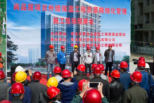 觀摩會當天,集團副總裁馬志驍、七分公司總經(jīng)理朱超等陪同黃島區(qū)質監(jiān)站領導進行了現(xiàn)場觀摩,上午9:00黃島區(qū)質監(jiān)站領導主持了現(xiàn)場觀摩會,對照實體樣板詳細講解保溫工程各工序質量保證要點。主要就工程實體保溫工程界面劑噴涂、玻纖網(wǎng)粘貼、加強層粘貼、窗洞口巖棉套割、錨栓固定等施工工藝進行了講解并宣布現(xiàn)場觀摩開始。黃島區(qū)各與會單位人員現(xiàn)場觀摩了實體工序樣板,各單位間相互切磋工藝做法,交流標準化管理經(jīng)驗。上午11:00觀摩人員陸續(xù)離開施工現(xiàn)場,現(xiàn)場觀摩會圓滿結束。