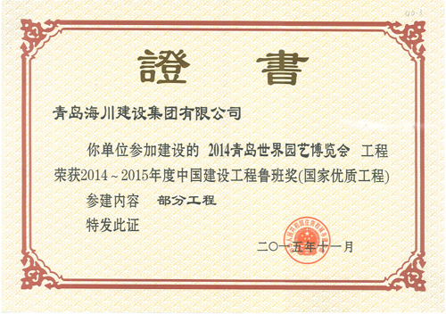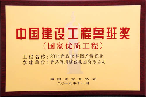 由海川集團(tuán)承建的2014青島世界園藝博覽會(huì)工程榮獲2014-2015年度中國(guó)建設(shè)工程魯班獎(jiǎng)(國(guó)家優(yōu)質(zhì)工程)。表彰大會(huì)于2015年11月16日在北京釣魚臺(tái)國(guó)賓館舉行,海川建設(shè)集團(tuán)有限公司四分公司主任工程師張棟參加了會(huì)議,并捧回中國(guó)建設(shè)工程魯班獎(jiǎng)(國(guó)家優(yōu)質(zhì)工程)獎(jiǎng)牌及證書。
